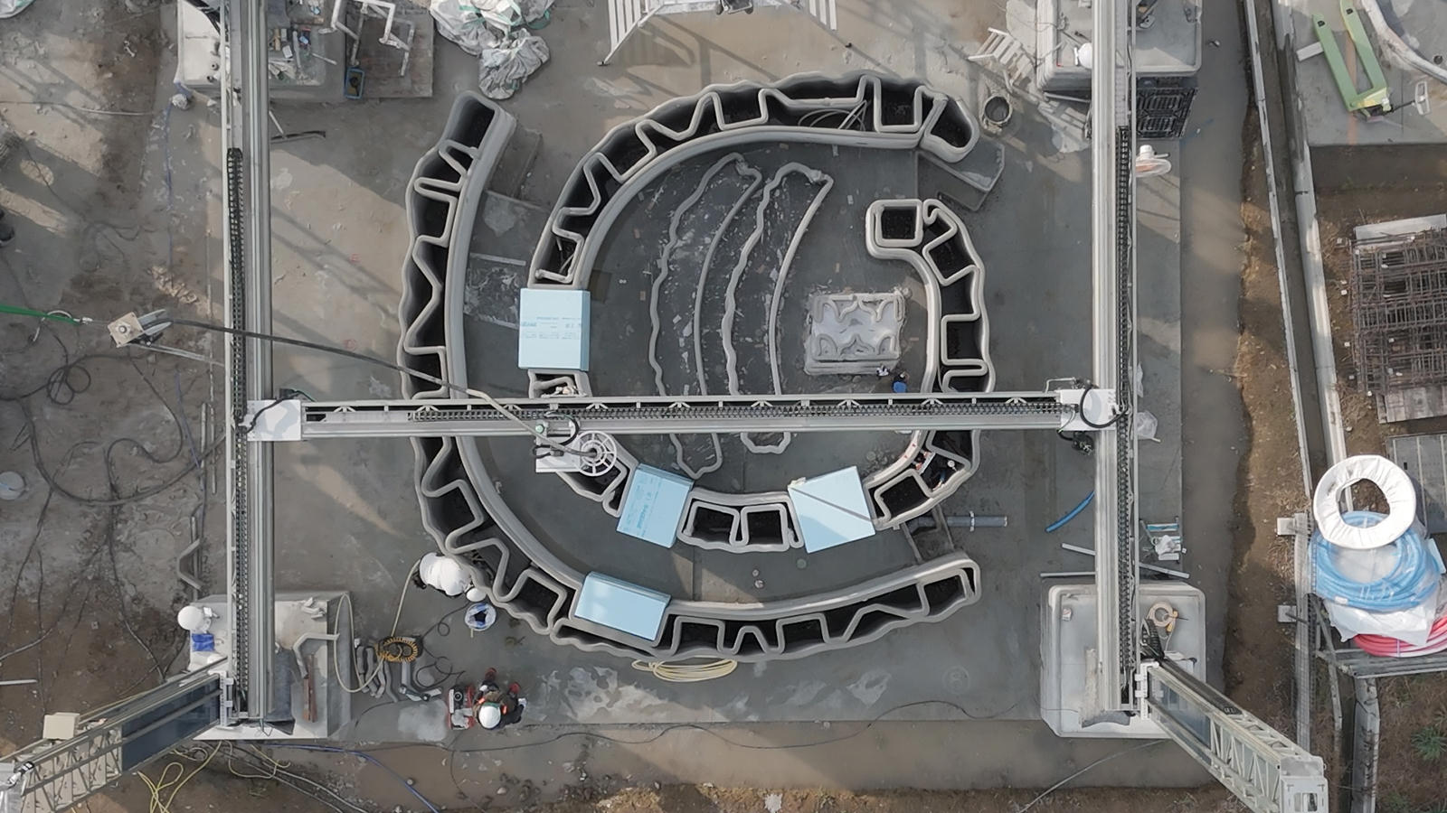 今回の住宅は、日本で初めて基礎から二階建て構造体までを現場で一体的に3Dプリントした点に大きな特徴がある。通常は基礎・構造・仕上げを別工程で分業するが、本建築ではRC構造や鉄筋を除いた大部分を大型3Dプリンターで一貫施工し、従来の手作業中心の工程では難しい精度と再現性を実現している。材料には、タイの大手建材メーカーSCG(Siam Cement Group)が開発した3Dプリント専用モルタルを採用し、日本の建築基準や気候条件に合わせて調整。これにより、複雑な形状や多層構造でも高い安全性を保ちながら、高精度なプリントが可能となった。