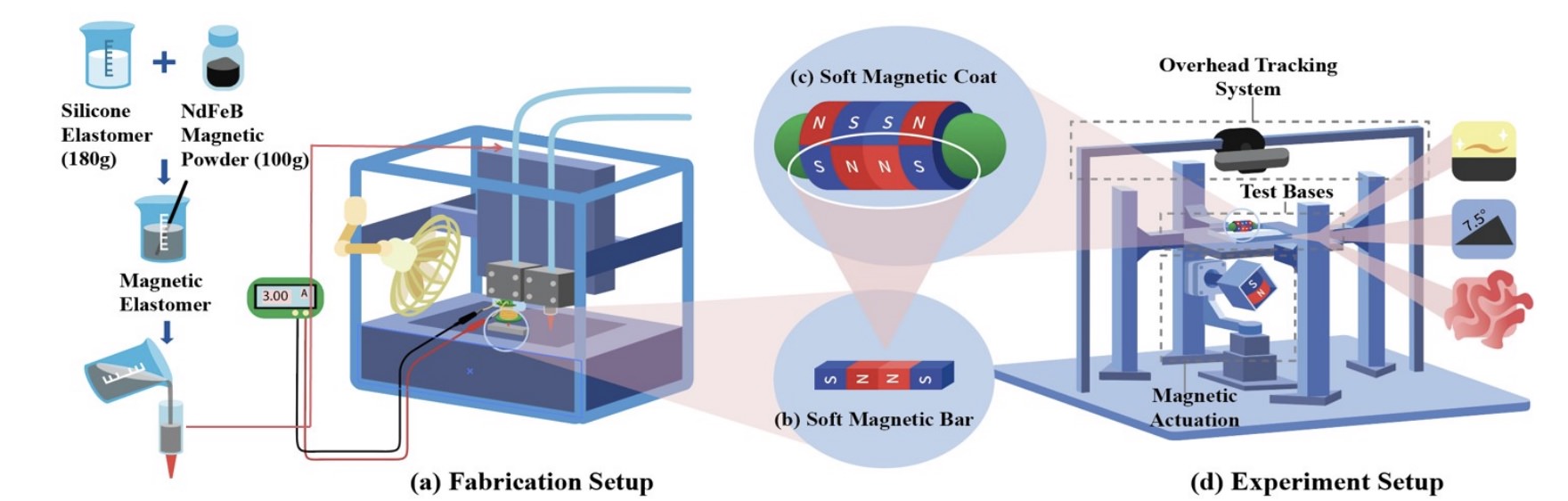 技術的な最大の特徴は、カプセル内部ではなく「外殻」に磁気機能を持たせた設計にある。ネオジム磁性粒子を混ぜた柔らかい材料を用い、それを3Dプリント技術で成形する際に磁化の向きを制御することで、外部磁場に対して安定して転がりながら移動できる構造を実現した。内部に大きな磁石を入れる必要がないため、カメラやセンサー、薬剤タンク、生検ツールなどを搭載できるスペースを確保できる。