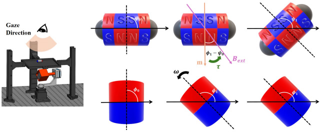 実験装置の俯瞰図。外部磁石のz軸周りの回転によるカプセルのヨー運動を示す。