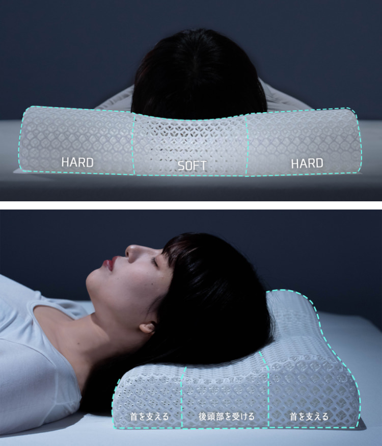 製造には、超高速光硬化方式の3Dプリンターを使用して、継ぎ目のない一体成形を実現。部位ごとに密度を最適化して設計されているため、細かな頭の動きにも柔軟に追従し、自然な寝返りを妨げない。これは従来のウレタン枕や綿枕では再現が難しかった、3Dプリント技術ならではの強みである。