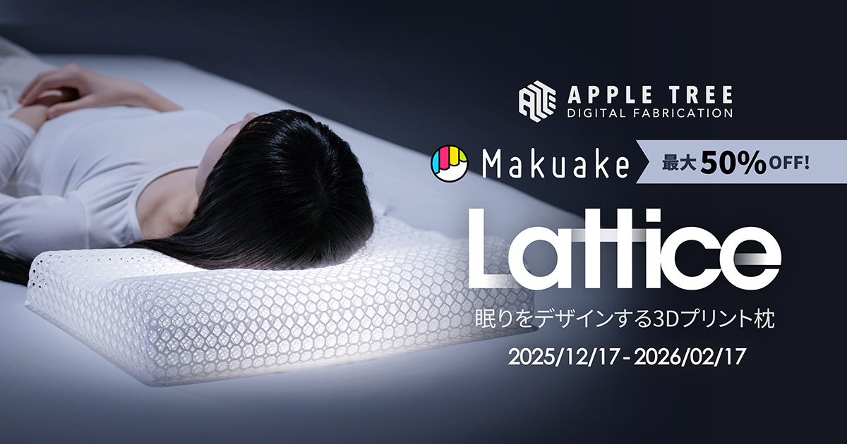 大阪市に本社を構え、3Dプリンターと先端素材を活用した生活用品の開発を手がける APPLE TREE は、最新の光硬化方式3Dプリント技術とバイオベース素材を採用した新構造枕『Lattice(ラティス)』を開発し、2025年12月17日よりクラウドファンディング「Makuake」にて支援受付を開始する。本製品は、3Dプリンターならではの精密な構造設計により、これまで両立が難しかった「柔らかさ」と「しっかりした支え」を同時に実現した次世代枕である。