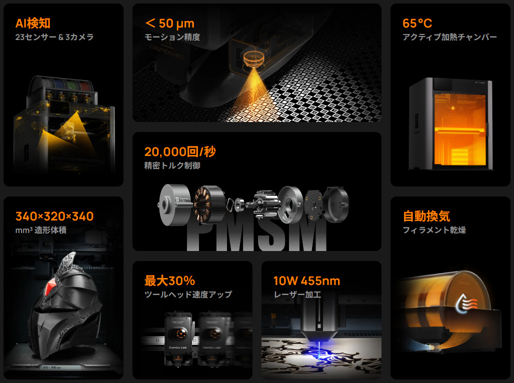 Bambu Lab独自のPMSMサーボ押出システムを採用し、押出力を67%向上。最大1,000mm/sの高速プリントと20,000mm/s²の加速度で、短時間でも大型造形を実現する。 - マルチマテリアルプリント