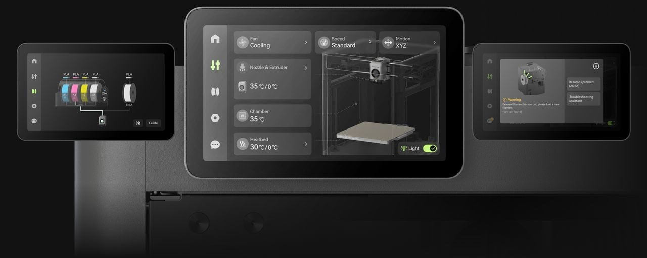 冷却機構には、外気を直接取り込むコールドエア冷却と、チャンバー内を50℃に保つアダプティブ・エアフロー・システムを組み合わせた独自構造を採用。これにより、低温フィラメントからエンジニアリング樹脂まで、あらゆる素材を最適環境でプリントできる。また、内部空気は活性炭フィルターで清浄化され、作業環境にも配慮されている。