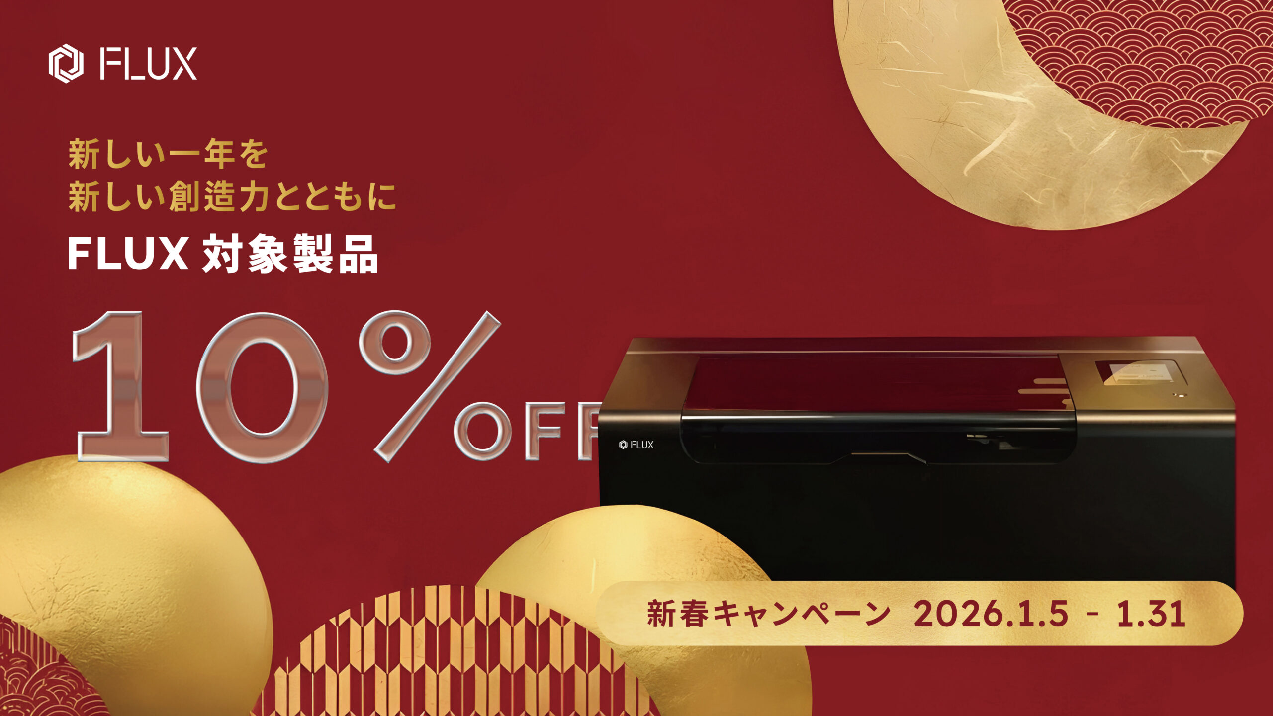 デジタル工作機器を通じて誰もがものづくりを楽しめる環境を提供する FLUX は、2026年のスタートに合わせた「FLUX新春キャンペーン」を実施し、対象となるレーザー加工機を10%オフで提供いたします。