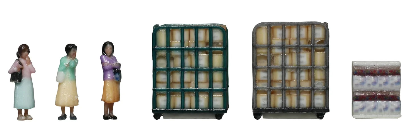 「6月の雨」では紫陽花とビニール傘を差した人々を、「スーパー前」ではカプセルトイ「ガチャ」マシンや買い物客をリアルに再現。特にガチャマシンは、タカラトミーアーツが展開する実機を取材し、中の極小カプセルまで再現するなど、驚きの細密表現を可能にした。