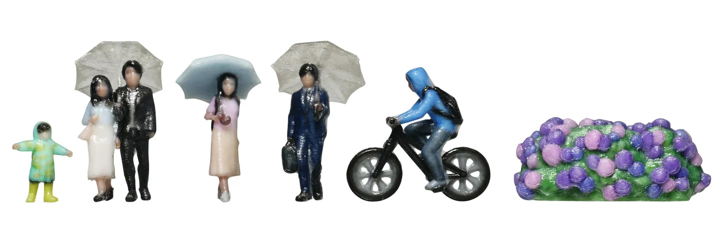 透明樹脂を活用した傘やガチャマシンなど、従来表現が難しかった造形も再現されており、ジオラマの世界に配置すれば、リアルで物語性のある情景が広がる。