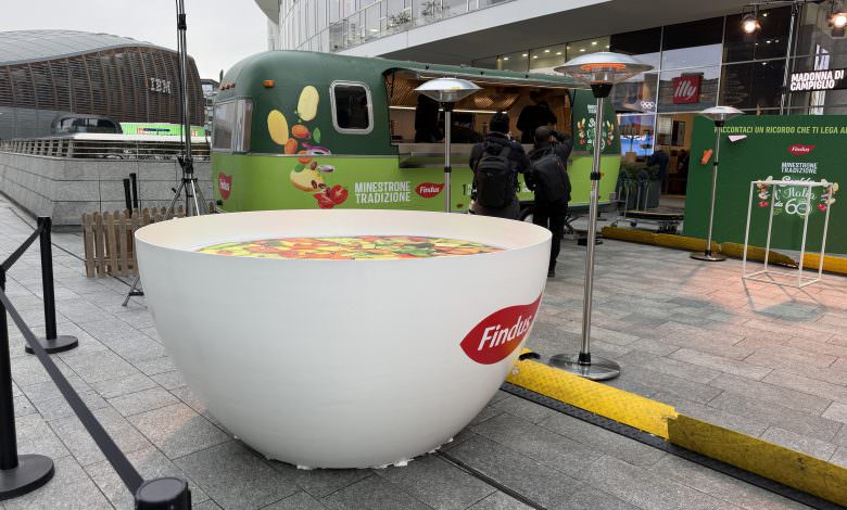 冷凍食品ブランドの Findus Italia は、ミネストローネ発売60周年の節目に、ブランドの定番価値を可視化する目的で、複合材の3Dプリンター造形による巨大スープカップをミラノに設置し、配食と寄付企画を同時に実施した。