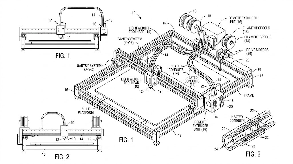 今回出願された特許は、この問題に対し、材料を溶かして送る押出機を中央に置き、そこから加熱した配管を通じて各ヘッドへ材料を送る仕組みを提案している。ヘッド側は軽いノズルと流量調整機構だけを持つため、動きやすさを保ちながら、大量の材料を扱える可能性がある。つまり、重い装置を動かすのではなく、材料だけを運んで軽いヘッドで造形する考え方である。