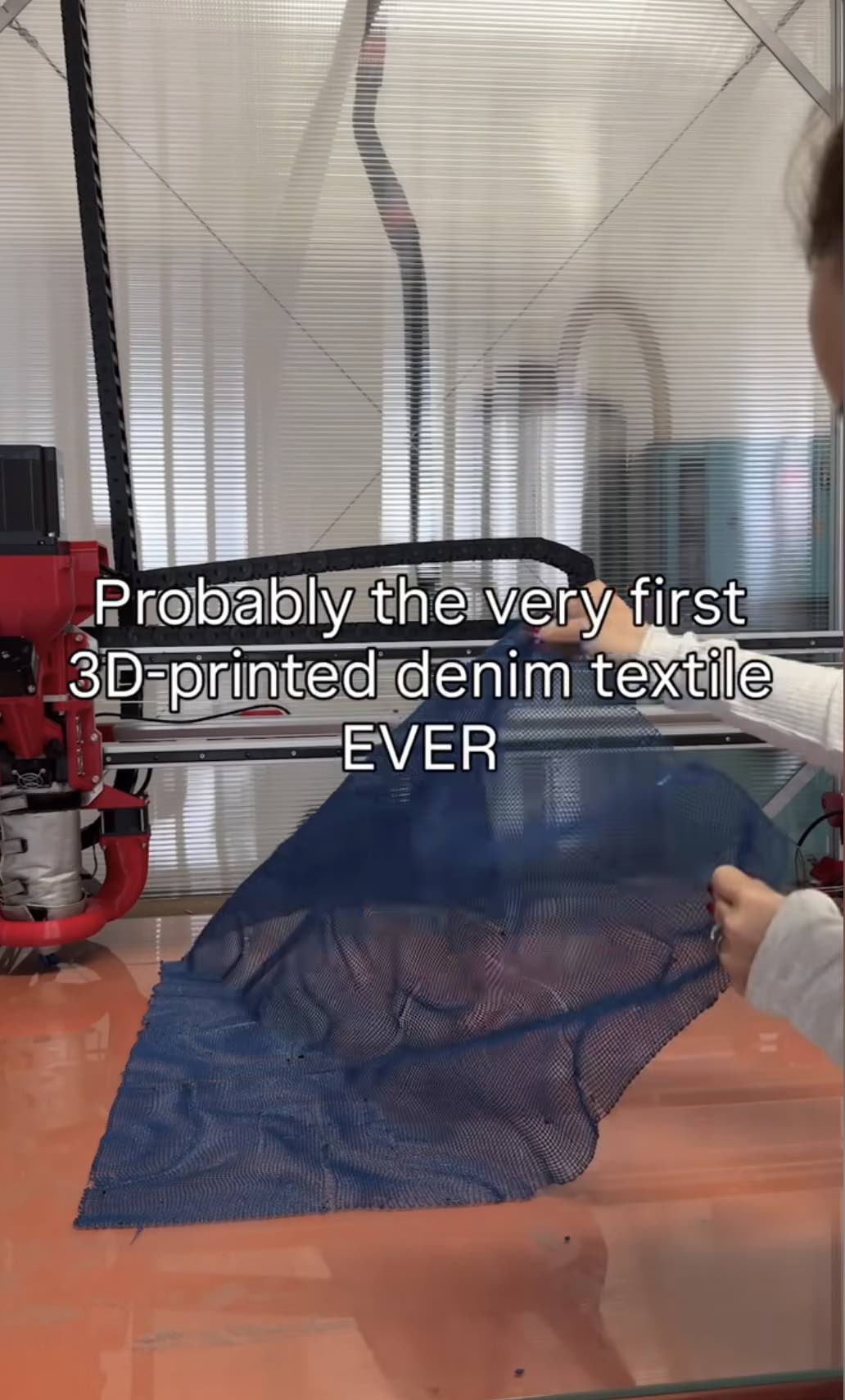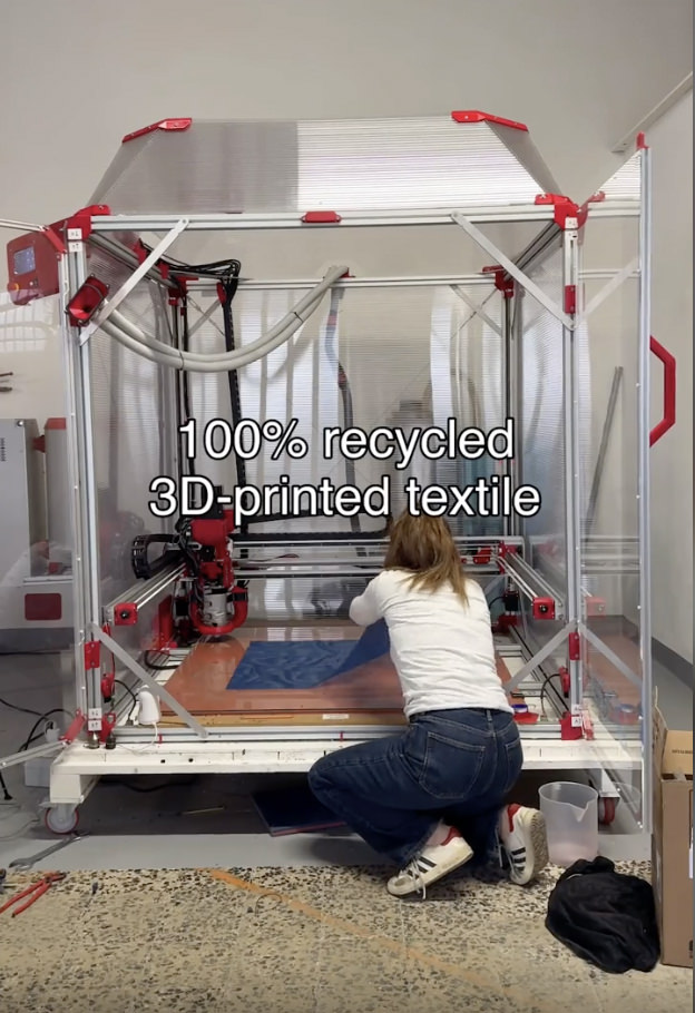 イタリアのデニム工場「PureDenim」から出るデニム廃材を細かい繊維に粉砕し、再生TPUと混合して作られる3Dプリント用ペレット素材は大判造形が可能で、大型の3Dプリンター「Ginger Additive」を用いた試験では、70×70cmの3Dプリント生地をわずか30分で作成した。