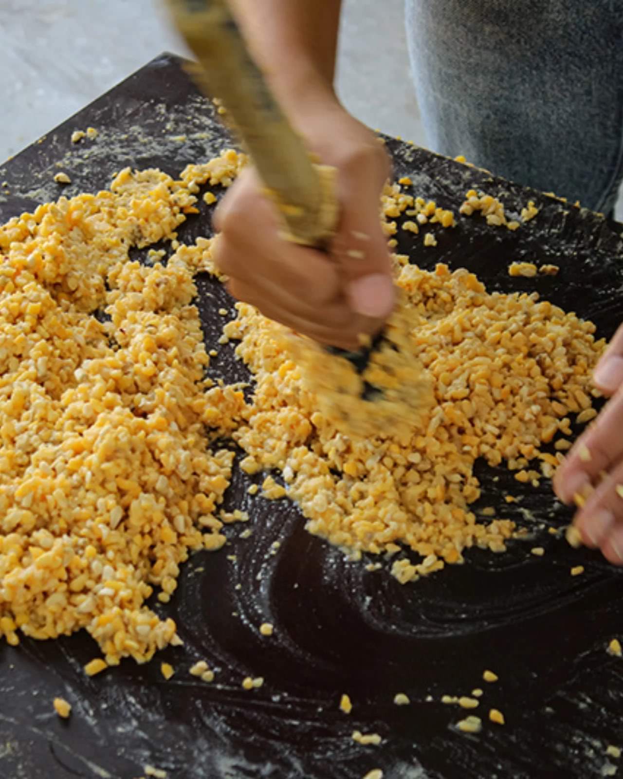 “corn(トウモロコシ)”と“concrete(コンクリート)”から名づけられた「CORNCRETL」は、石灰系骨材・トウモロコシ残渣・ネハヨテ(トウモロコシをアルカリ水で煮て加工する伝統工程”ニシュタマリゼーション”の際に出る、カルシウムを多く含んだ白濁の排水)を組み合わせたバイオ建材で、廃棄物を再資源化しながら建設材料として活用する発想の素材である。