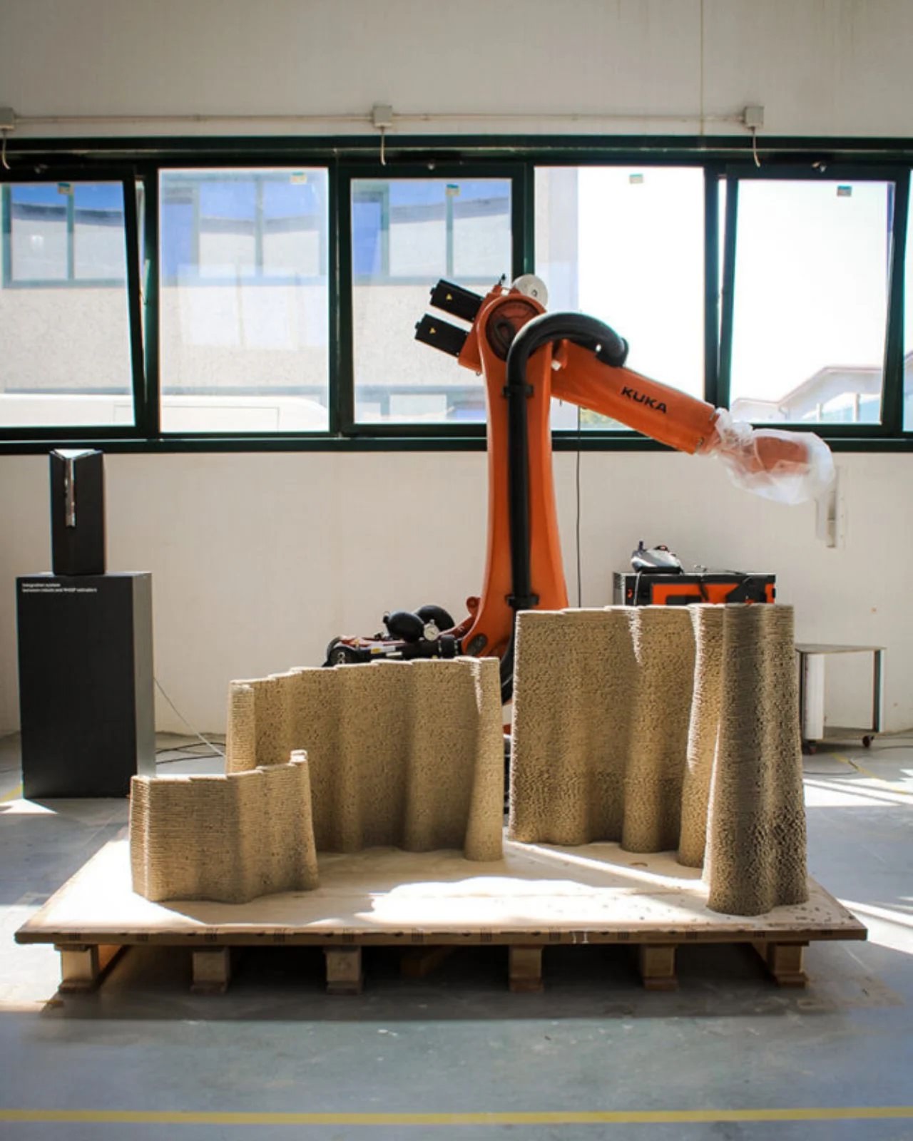 実証としてイタリアの研究拠点で原寸構造物が制作されており、循環型材料と3Dプリンター建設の実用化可能性を示す事例となっている。