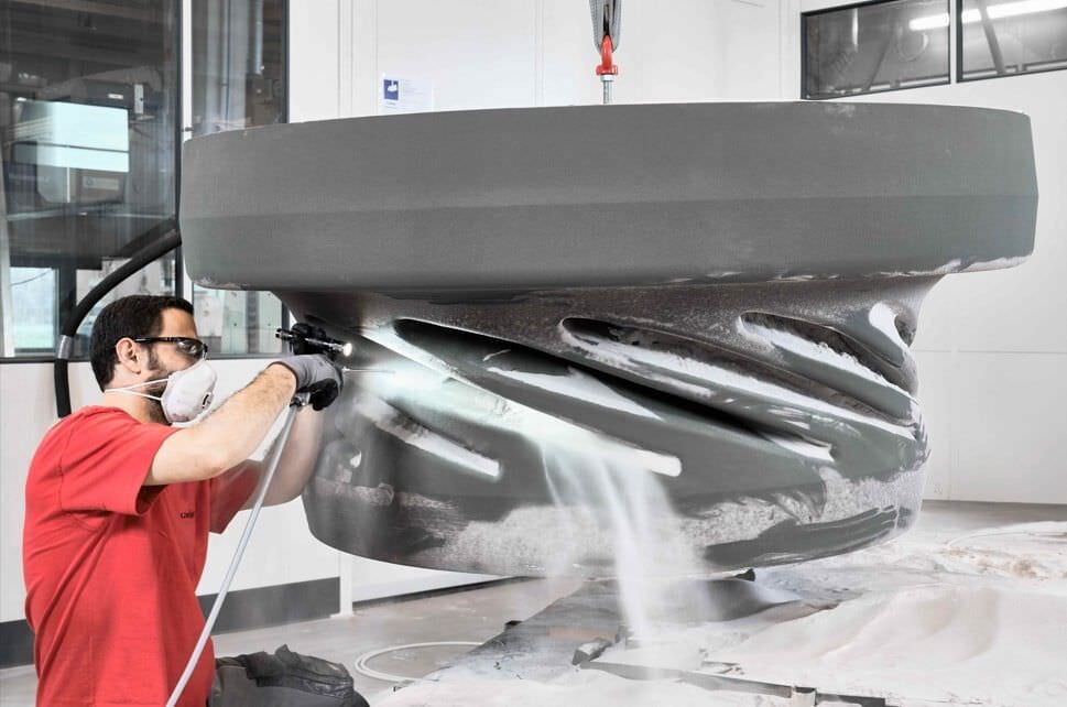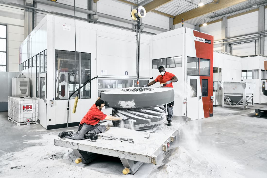 本システムは、voxeljet GmbH がGEとの共同開発で手がけたVX9000で得られた知見を基に設計されている。VX9000では全長9.5mに及ぶ鋳造用砂型の出力が実現されており、その実績を踏まえ、VX7000では量産対応を前提とした構造設計、精度の向上、材料使用効率の最適化が進められた。単なるサイズ拡大にとどまらず、工業生産に耐えうる信頼性と再現性を備えた点が大きな進化といえる。