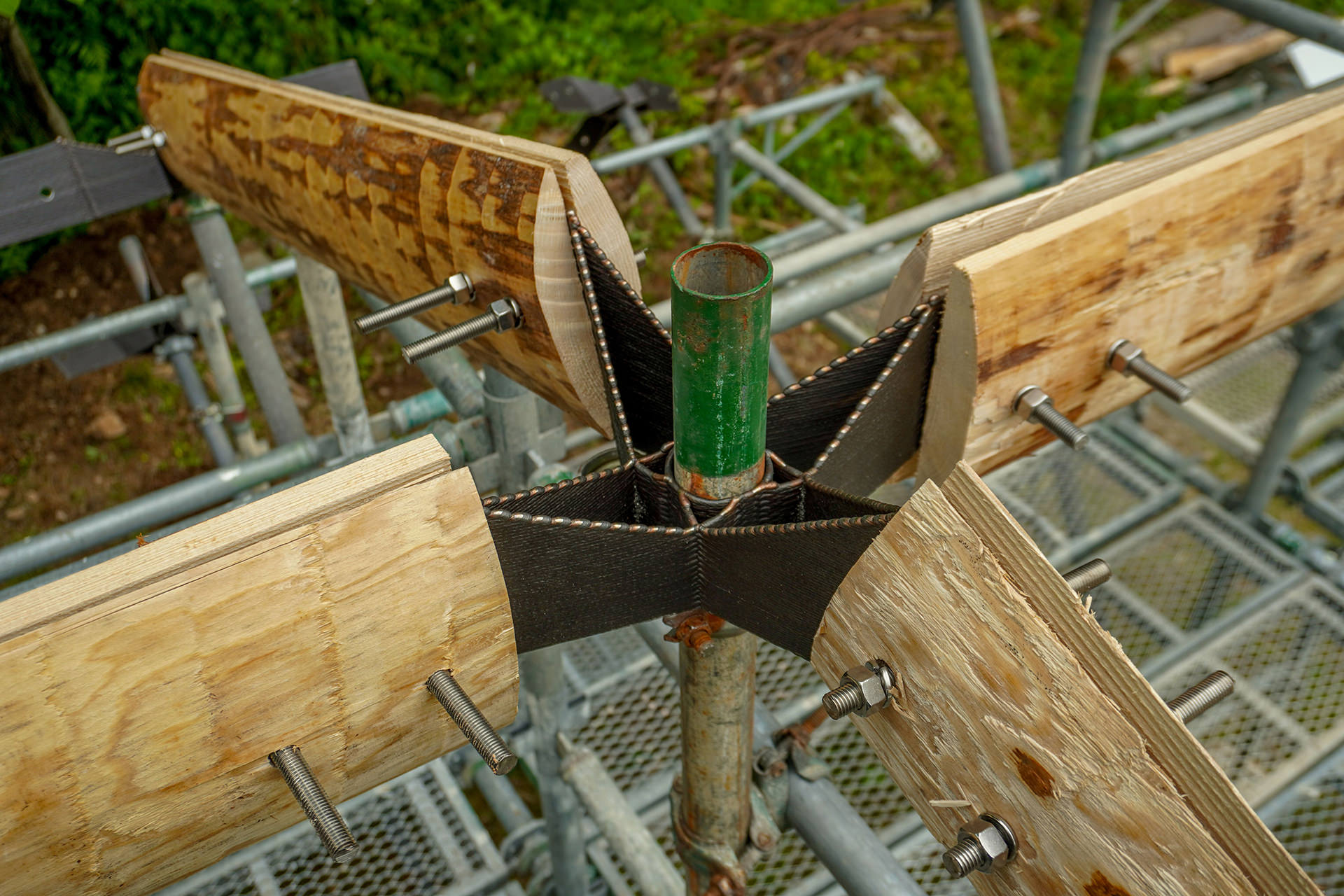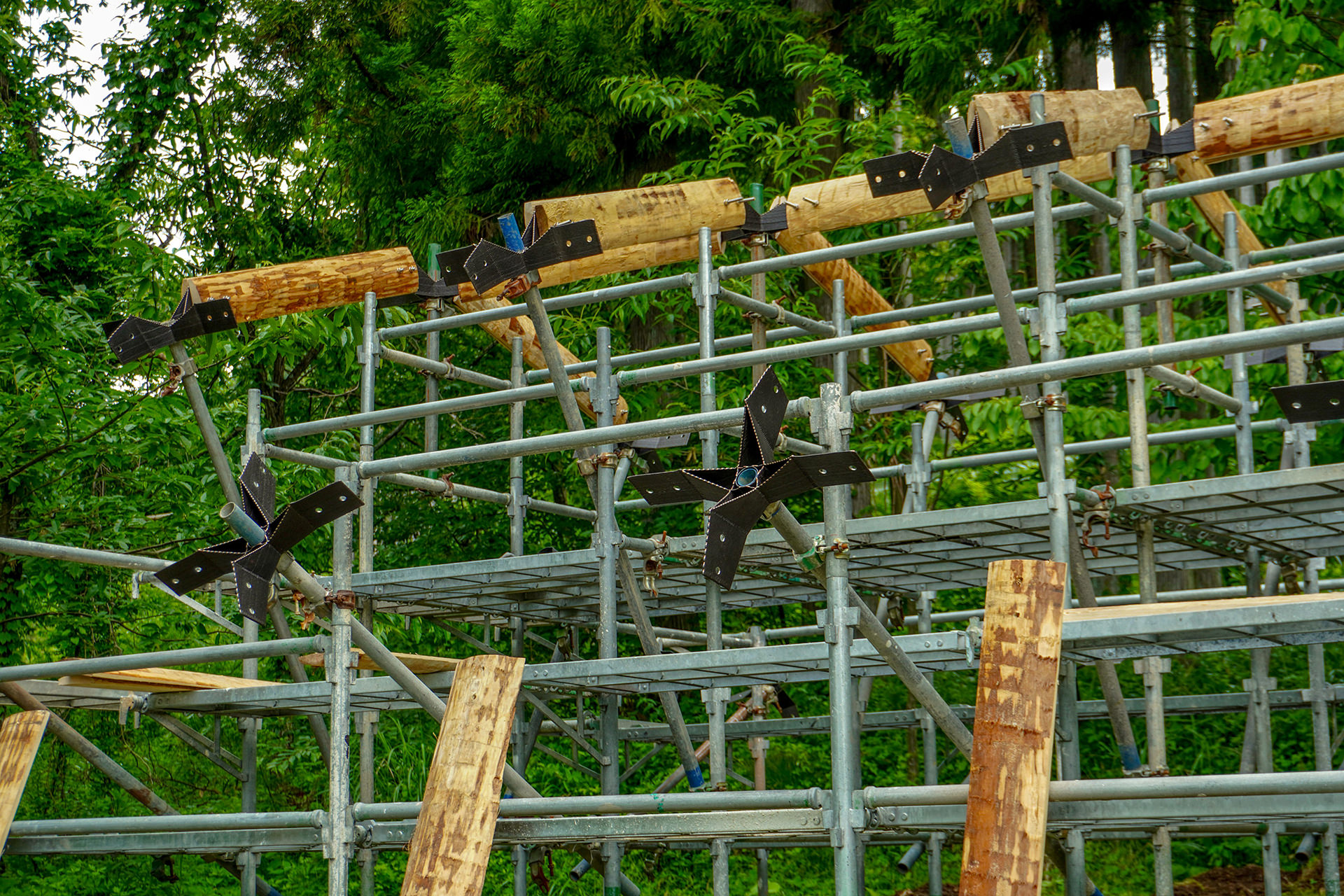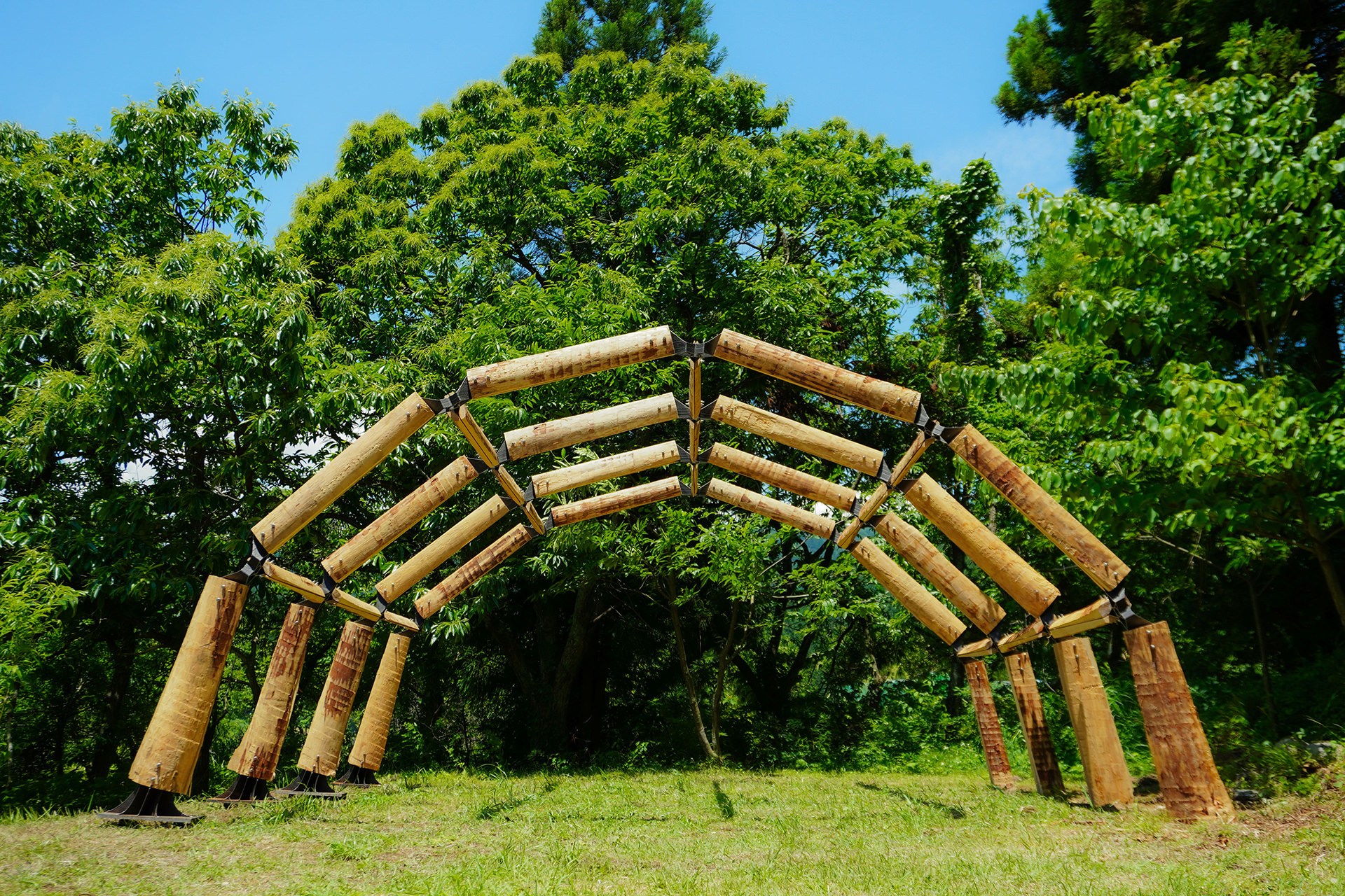また本プロジェクトでは、三重県熊野市の製材業者nojimokuと連携し、通常は廃棄される三日月状のミミ材やチップ材を構造材として再活用した。金属3Dプリンター製ジョイントと組み合わせることで、ばらつきのある木材にも対応できる新たな建築手法が成立し、地域材の価値向上と森林資源の循環利用を促す仕組みを構築した。